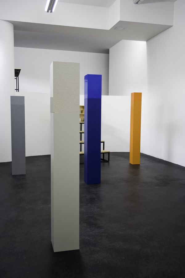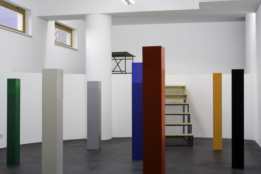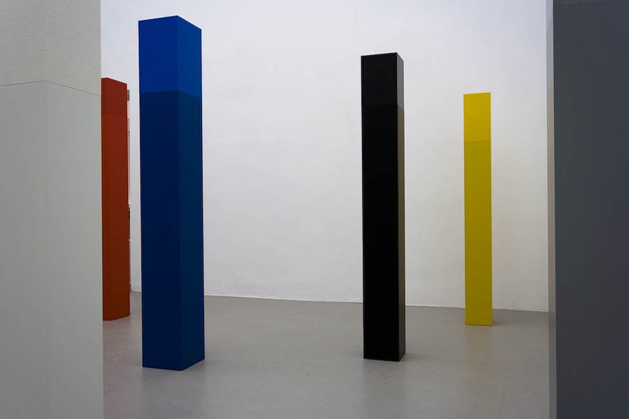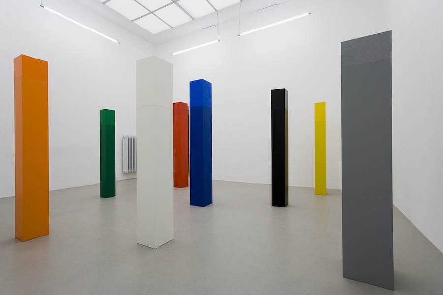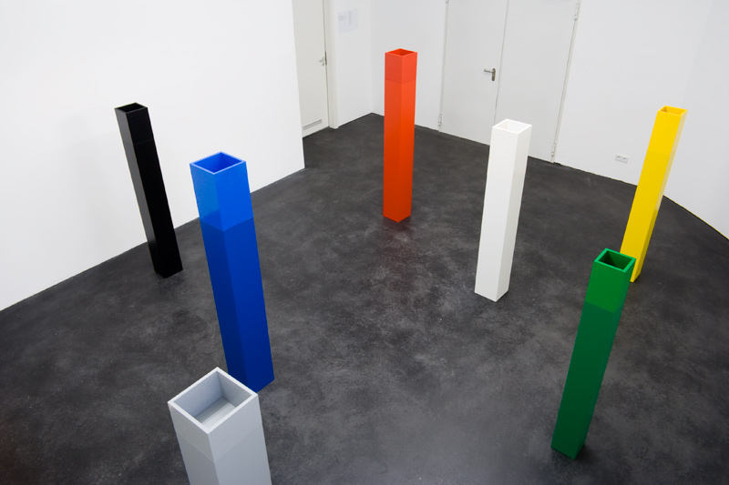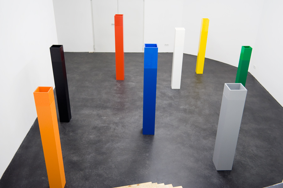 Acht Säulen unterschiedlicher Größe in den Farben Schwarz, Weiß, Grau, Blau, Rot, Gelb, Grün, Orange.
