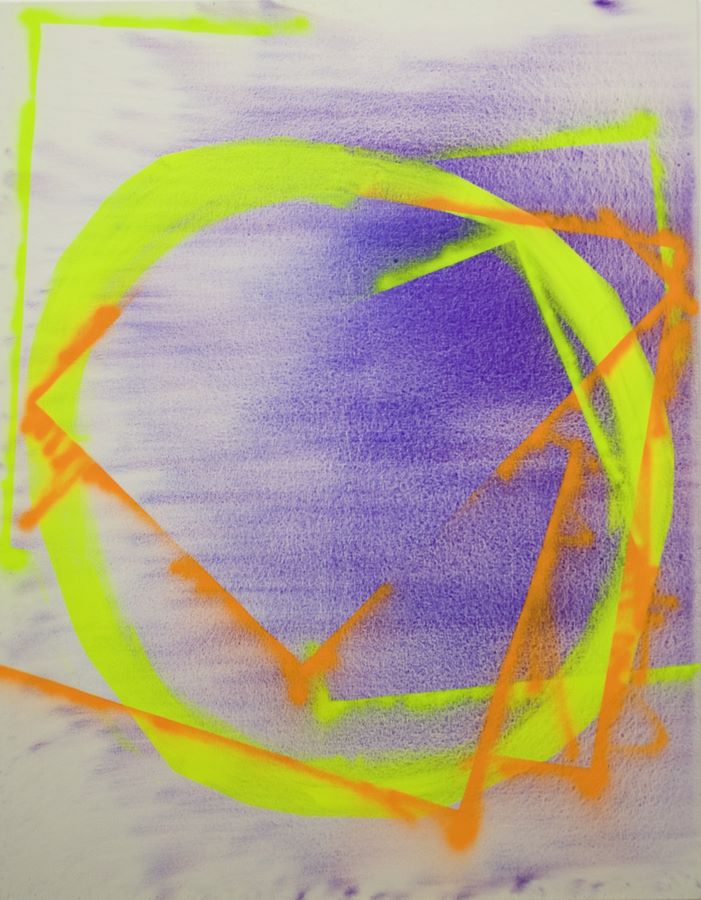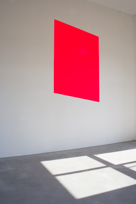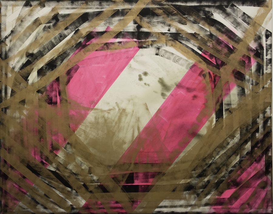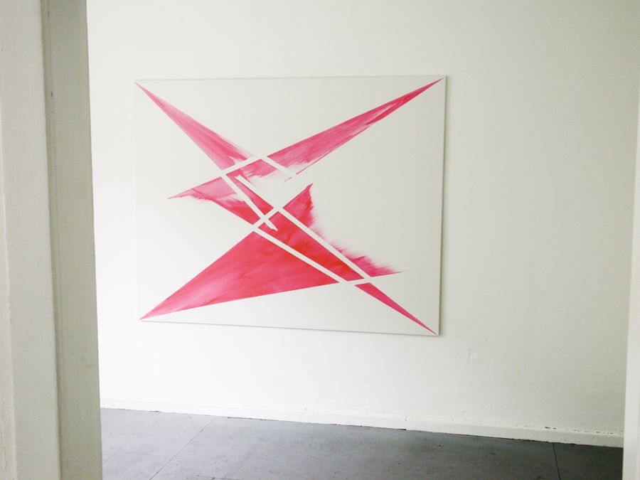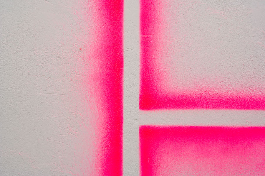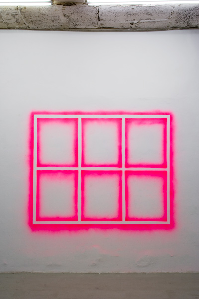 Keilrahmen an die Wand gedübelt, mit fluoreszierendem Acrylspray in Pink