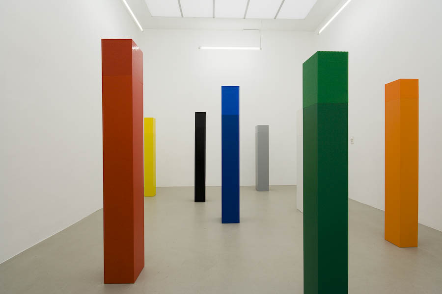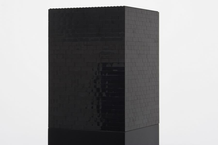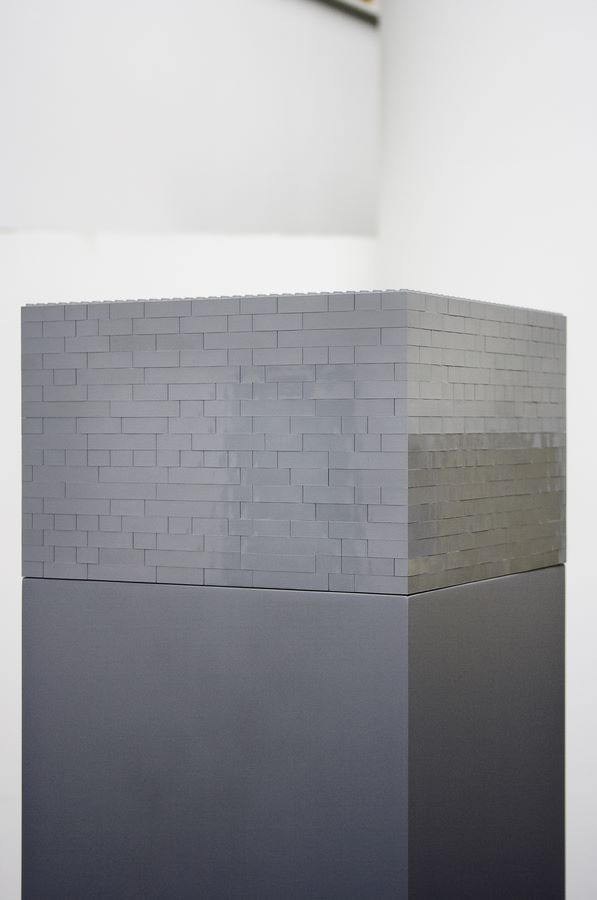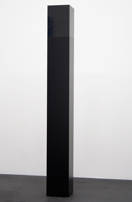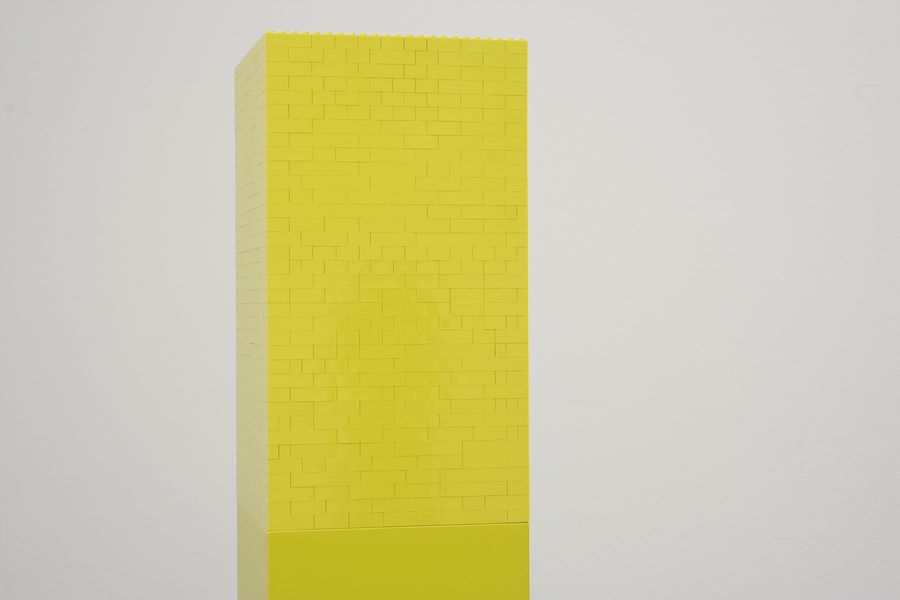 Turm aus Lego-Steinen auf lackiertem Sockel aus MDF, Grundfläche und Farbigkeit von Skulptur und Sockel sind identisch.