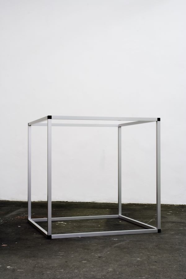 Vierkantrohre und Verbindungen eines Stecksystems sind zu einem Kubus mit offenen Seitenflächen zusammengefügt.