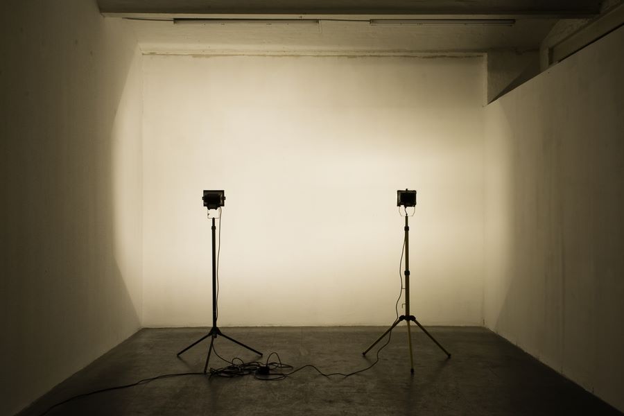 SCENE, 2004, Baustrahler, Stative, Kabeltrommel, Ghettoblaster, Soundtrack, Wandmaße: 308 x 407 cm